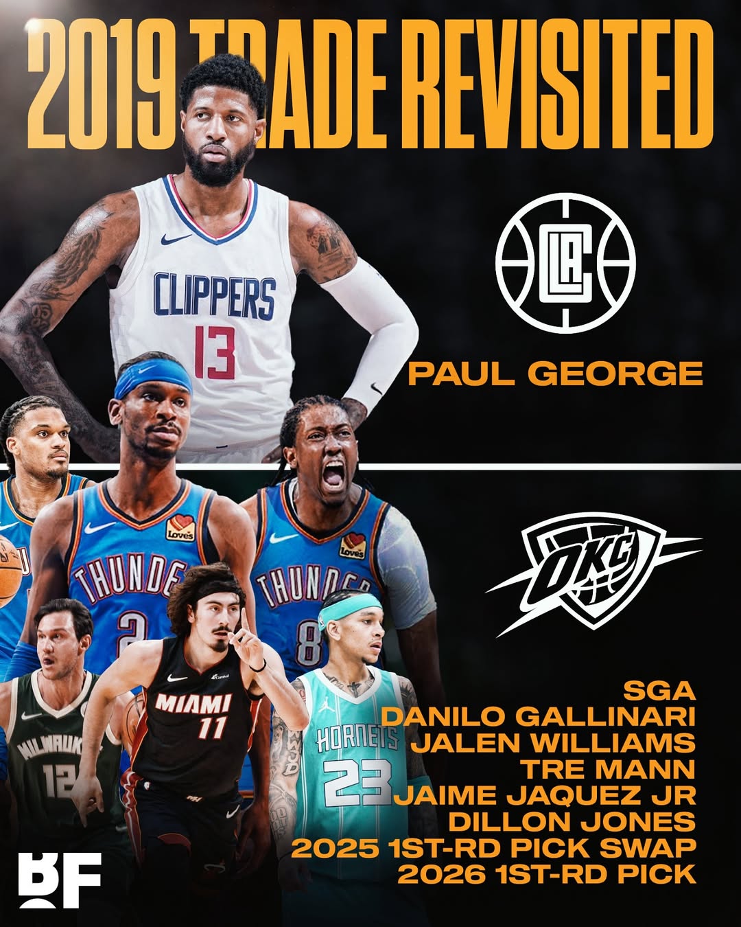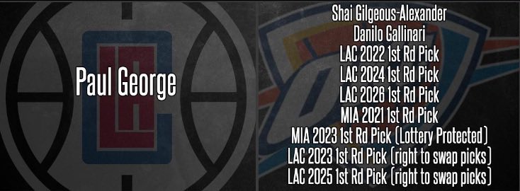 乔治当年交易详情:快船将亚历山大、加里纳利、四个不受保护的首轮签+一个乐透保护的首轮签以及两个首轮签交换权送至雷霆。
